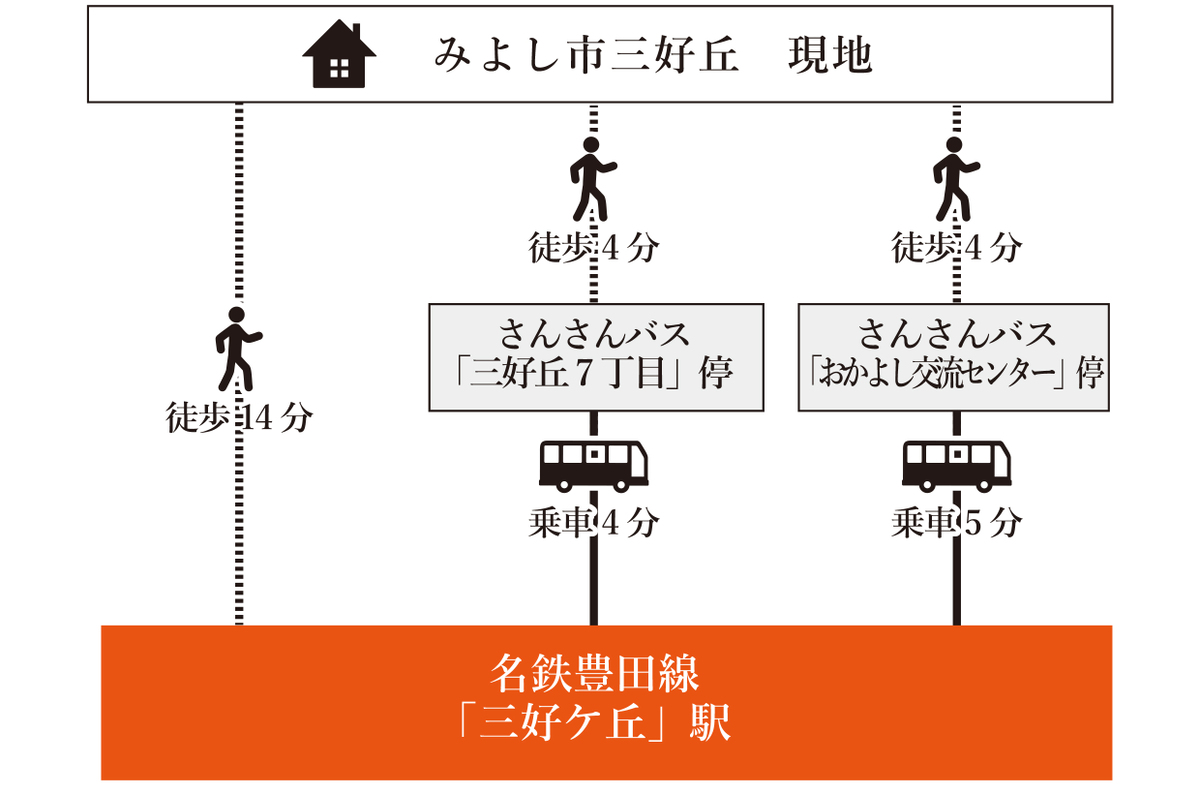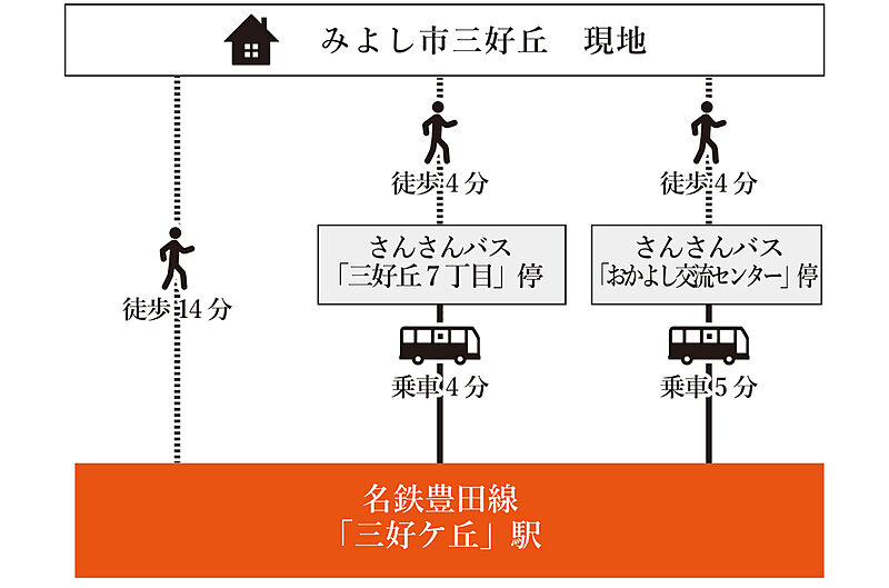 名鉄豊田線「三好ケ丘」駅 徒歩14分 名鉄豊田線「三好ケ丘」駅 さんさんバス「三好丘7丁目」停 徒歩4分 乗車4分 名鉄豊田線「三好ケ丘」駅 さんさんバス「おかよし交流センター」停 徒歩4分 乗車5分 |