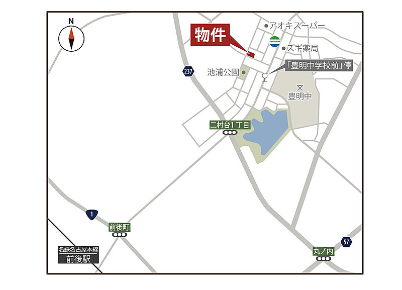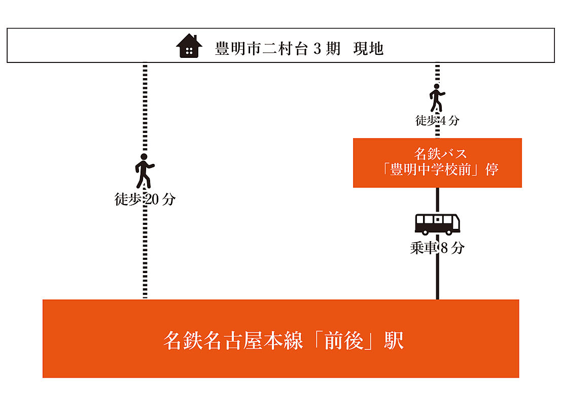名鉄名古屋本線「前後」駅 徒歩20分 市営バス「豊明中学校前」停 徒歩4分 名鉄名古屋本線「前後」駅まで乗車8分 |