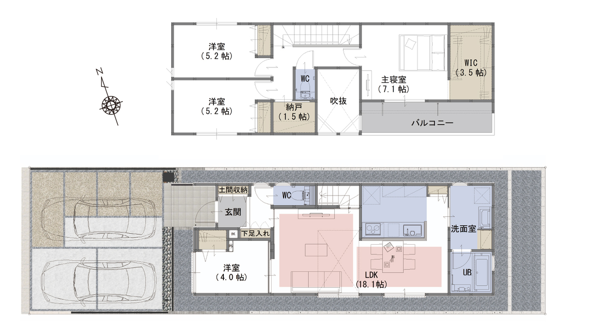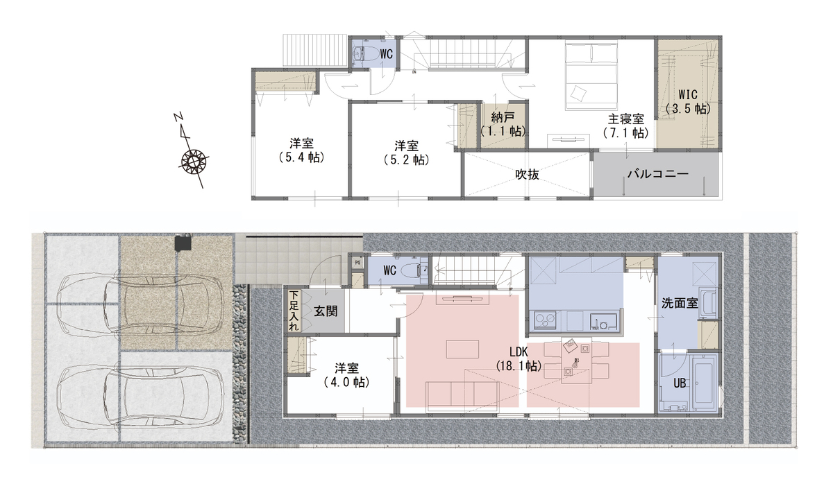 | 建物面積 | 101.87m2(A・B号棟) | 土地面積 | 128.57m2(B号棟)~128.58m2(A号棟) |