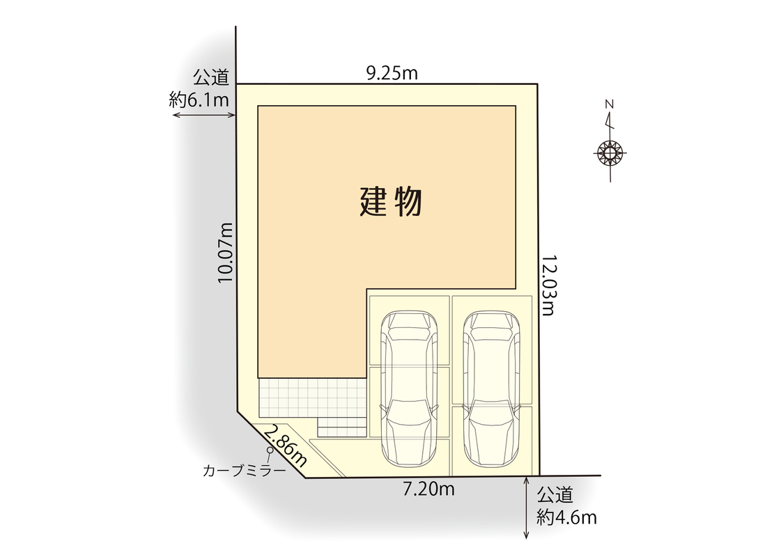 | 駐車場 | 2台 | 道路の幅員 | 西側6.1m、南側4.6m |