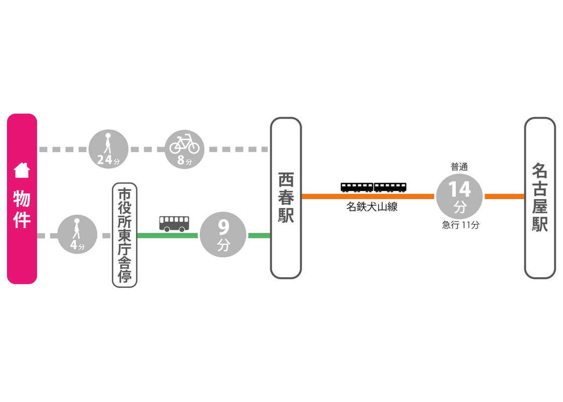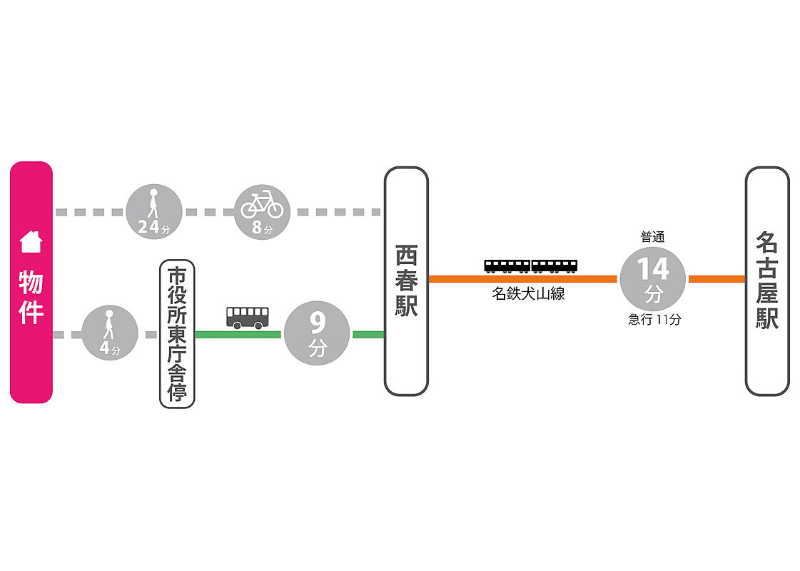 名鉄犬山線「西春」駅 徒歩24分 名鉄犬山線「徳重・名古屋芸大」駅 徒歩26分 名鉄犬山線「大山寺」駅 徒歩38分 |