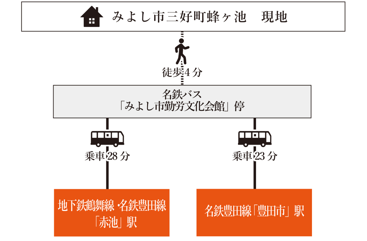 名鉄豊田線「豊田市」駅 名鉄バス「みよし市勤労文化会館」停 徒歩4分 乗車23分 名古屋市営鶴舞線「赤池」駅 名鉄バス「みよし市勤労文化会館」停 徒歩4分 乗車28分 名鉄豊田線「米野木」駅 徒歩68分 |