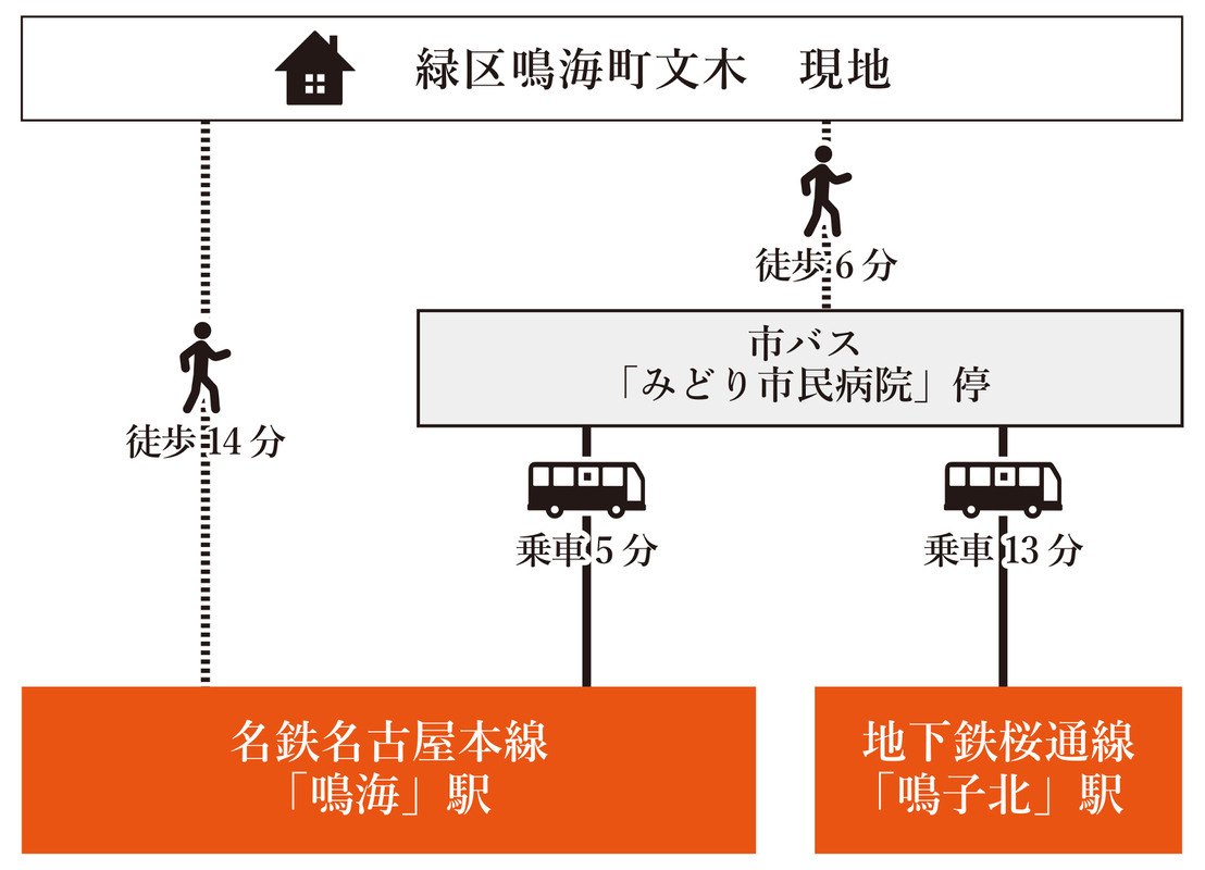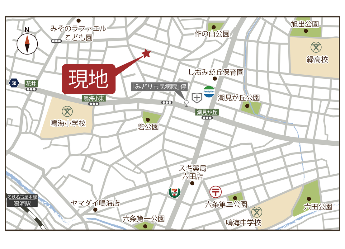 名鉄名古屋本線「鳴海」駅 徒歩14分 市営バス「みどり市民病院」停 徒歩6分 名鉄名古屋本線「鳴海」駅まで乗車5分 市営バス「みどり市民病院」停 徒歩6分 地下鉄桜通線「鳴子北」駅まで乗車13分 |