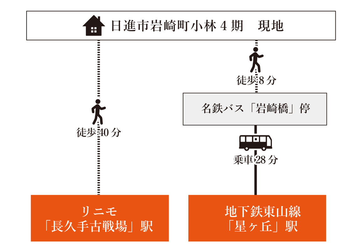 愛知高速東部丘陵線「長久手古戦場」駅 徒歩40分 名古屋市営東山線「星ヶ丘」駅 名鉄バス「岩崎橋」停 徒歩8分 乗車28分 名鉄豊田線「日進」駅 徒歩47分 |