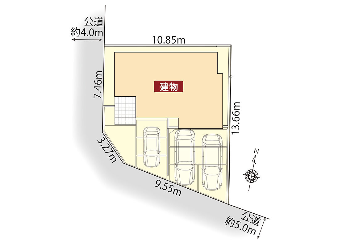 | 駐車場 | 3台 | 道路の幅員 | 南側公道幅員約5.0m、西側公道幅員約4.0m |