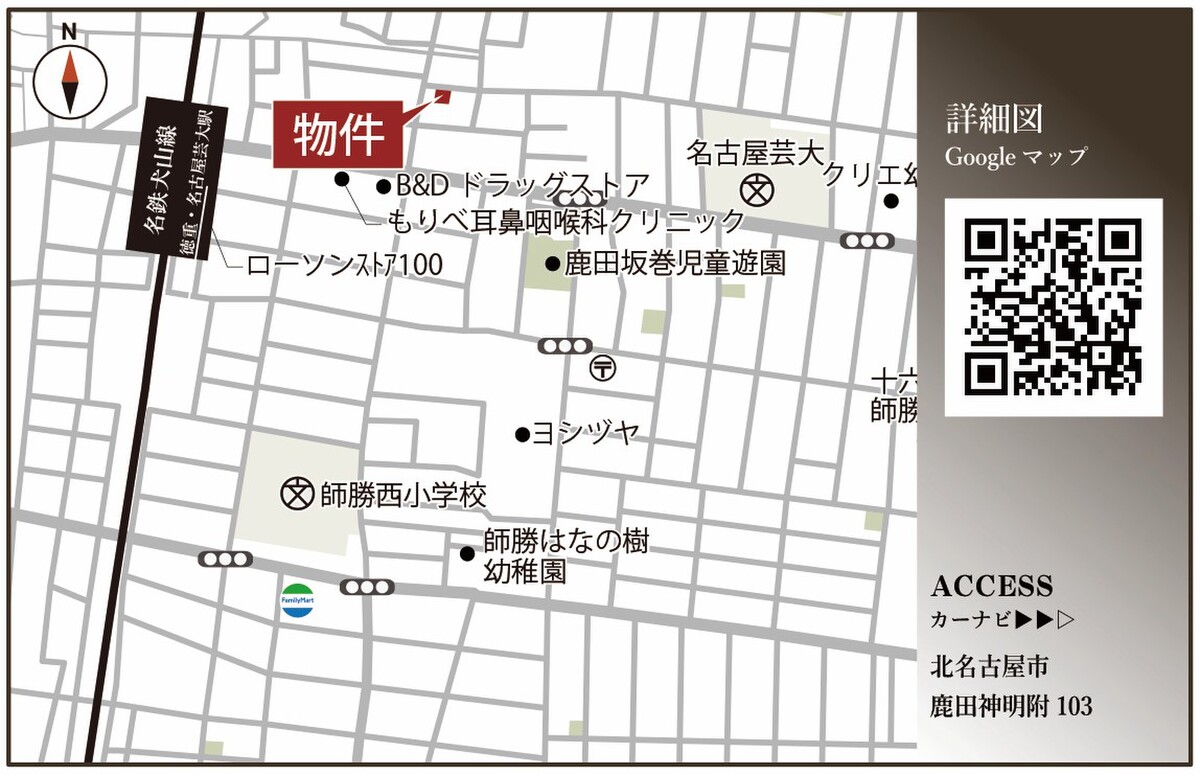 - 名鉄犬山線「徳重・名古屋芸大」駅 徒歩6分名鉄犬山線「大山寺」駅 徒歩16分名鉄犬山線「西春」駅 徒歩25分