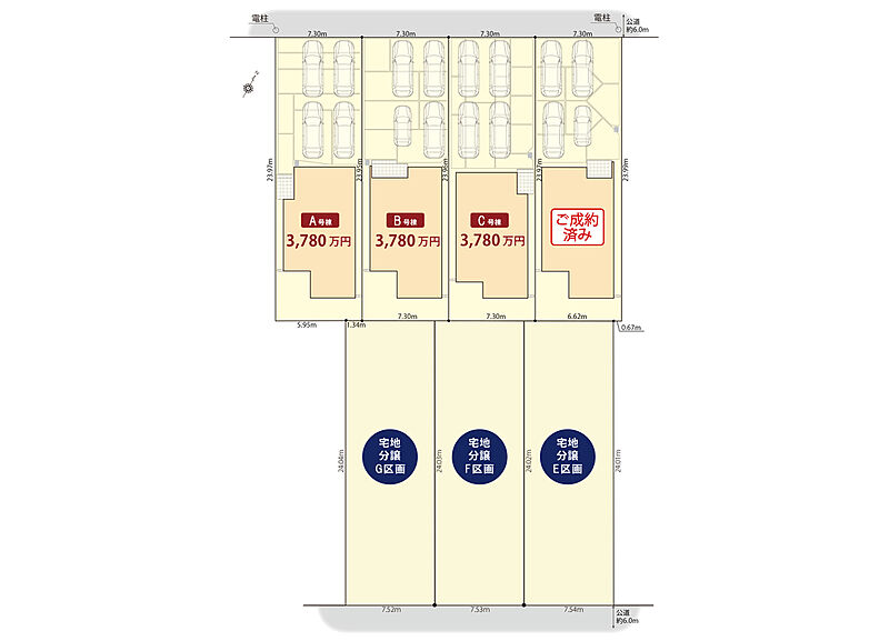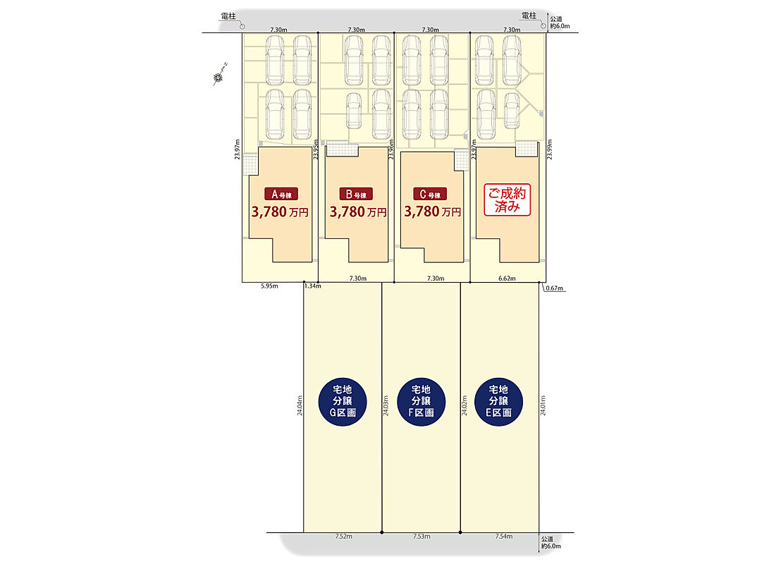 | 建物面積 | 103.93m2(B号棟)~104.77m2(A号棟) | 土地面積 | 175.02m2(B・C号棟)~175.03m2(A号棟) |