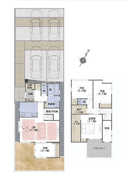 | 駐車場 | 4台 | 道路の幅員 | 北西側6.0m |