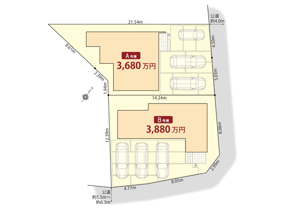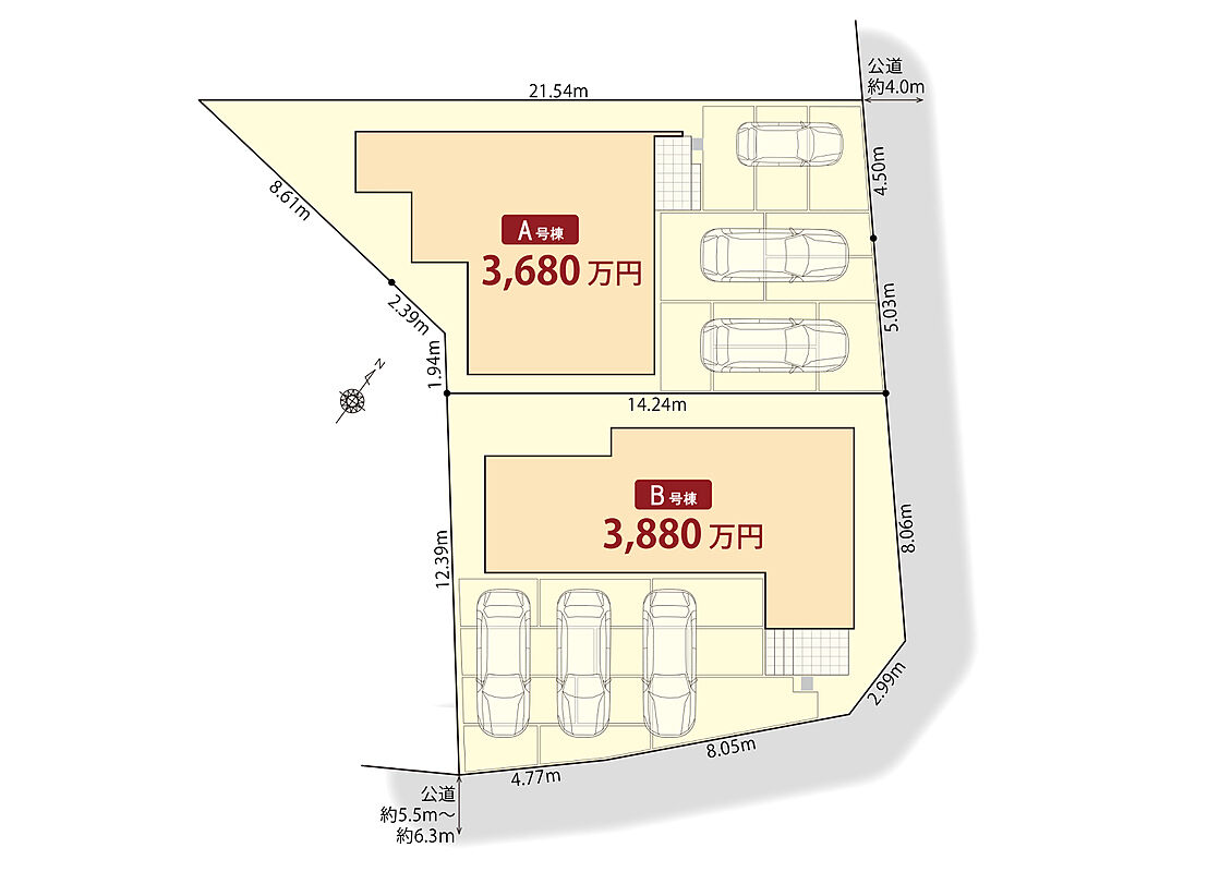 | 駐車場 | 3台 | 道路の幅員 | 北東側4.0m、南東側5.5~6.3m |
