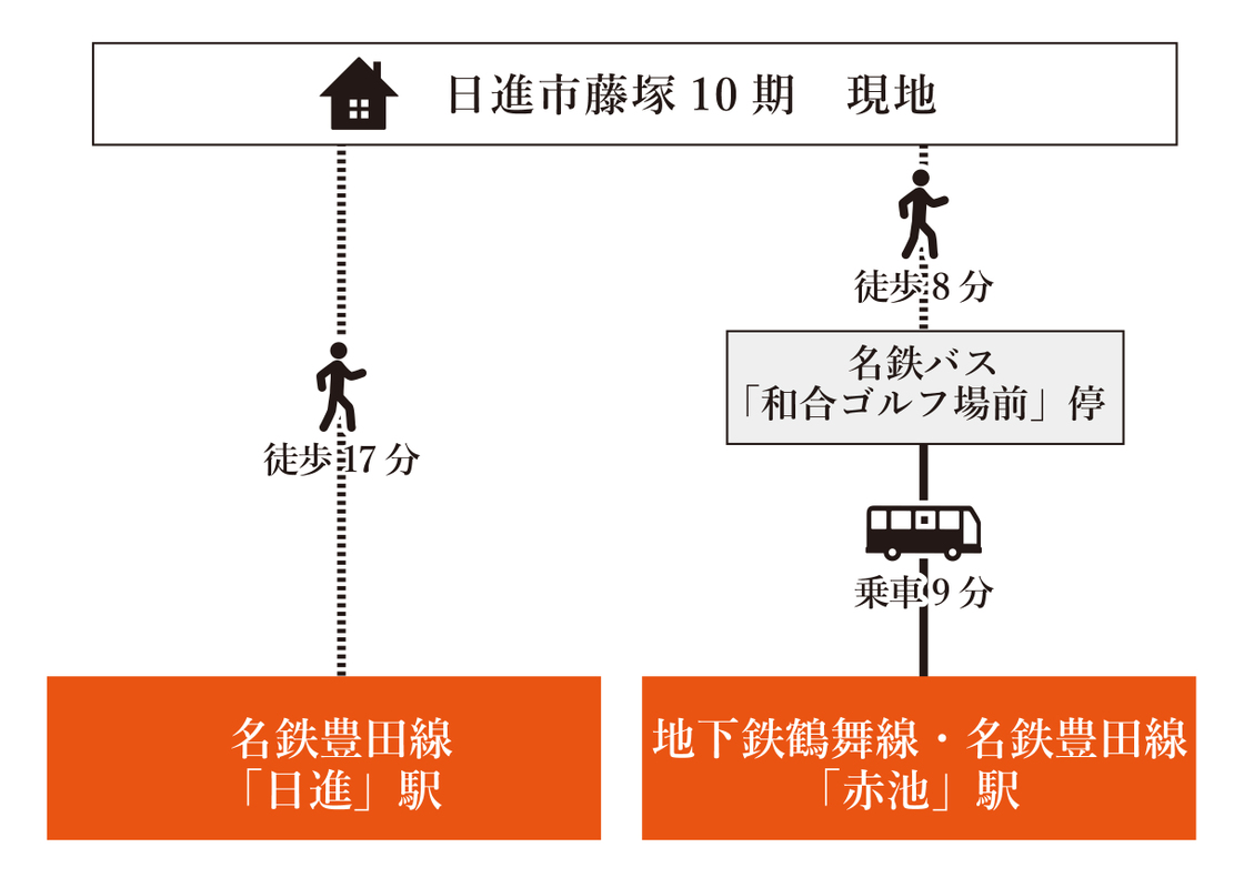 名鉄豊田線「日進」駅 徒歩17分 名古屋市営鶴舞線「赤池」駅 名鉄バス「和合ゴルフ場前」停 徒歩8分 乗車9分 名古屋市営鶴舞線「赤池」駅 徒歩29分 |