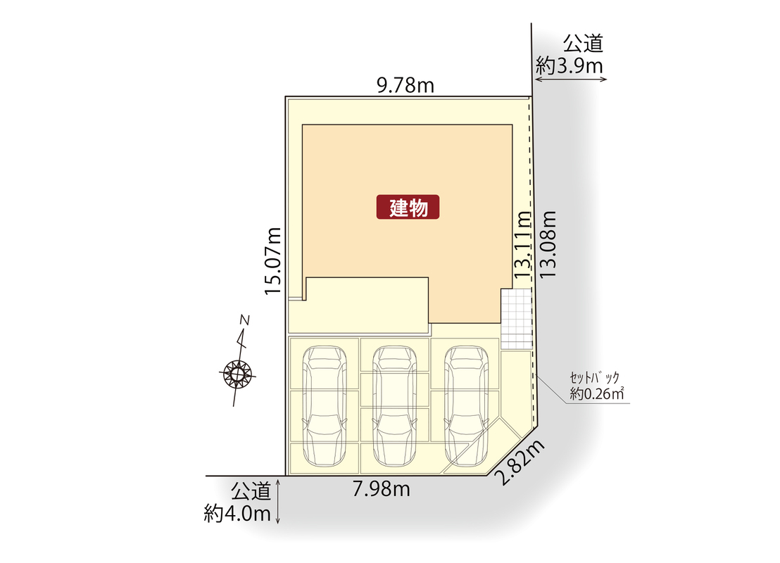 | 駐車場 | 3台 | 道路の幅員 | 東側公道幅員約3.9m、南側公道幅員約4.0m |