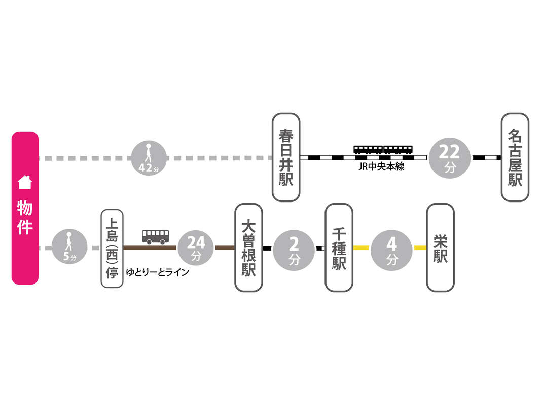 名古屋市営名城線「大曽根」駅 ゆとりーとライン24分「上島(西)」停 徒歩5分 JR中央本線「春日井」駅 徒歩42分 ガイドウェイバス志段味線「小幡緑地」駅 徒歩35分 |