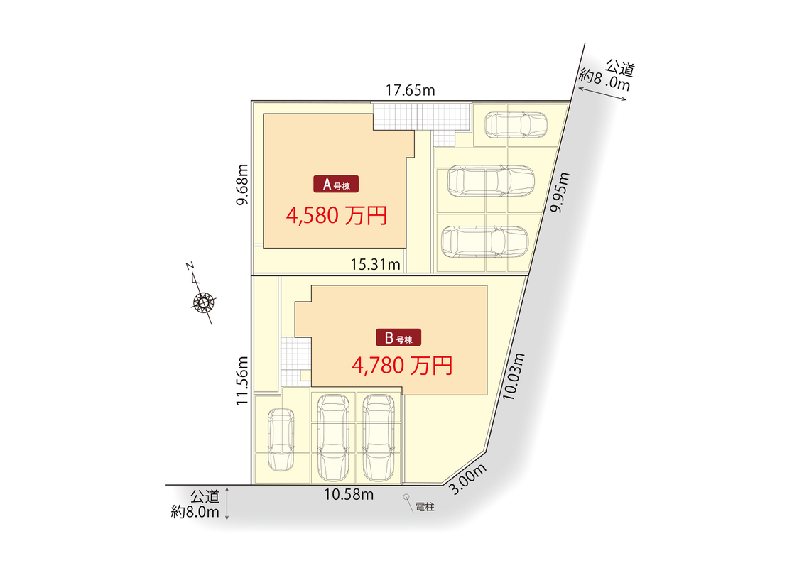| 駐車場 | 3台 | 道路の幅員 | 南東側公道幅員約8.0m、南西側公道幅員約8.0m |