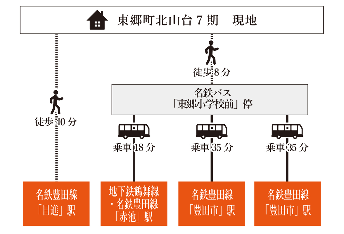 名鉄豊田線「日進」駅 徒歩40分 名古屋市営鶴舞線「赤池」駅 名鉄バス「東郷小学校前」停 徒歩8分 乗車18分 名鉄豊田線「豊田市」駅 名鉄バス「東郷小学校前」停 徒歩8分 乗車35分 |