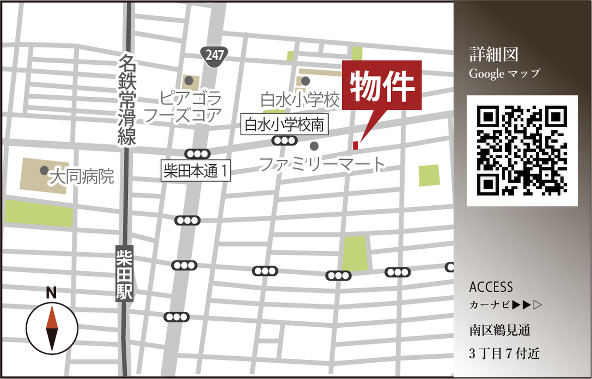 名鉄常滑線「柴田」駅 徒歩10分 名鉄常滑線「大同町」駅 徒歩13分 名鉄常滑線「名和」駅 徒歩26分 |