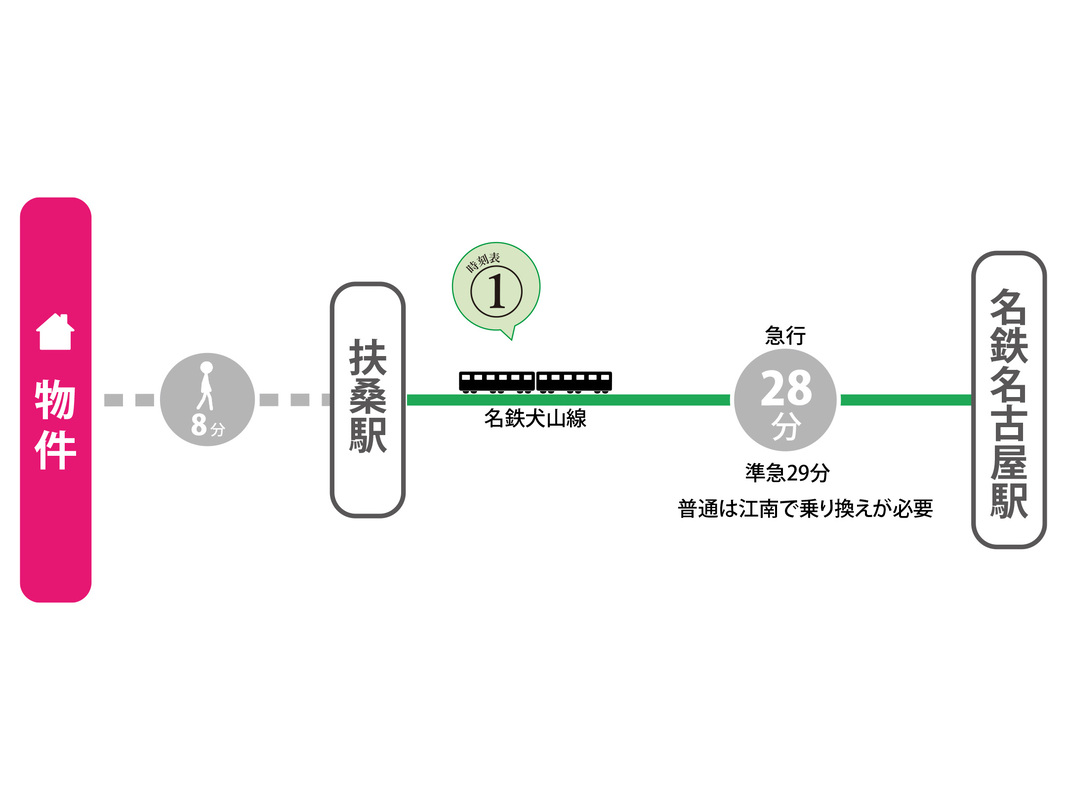 名鉄犬山線「扶桑」駅 徒歩8分 名鉄犬山線「木津用水」駅 徒歩10分 名鉄犬山線「犬山口」駅 徒歩35分 |