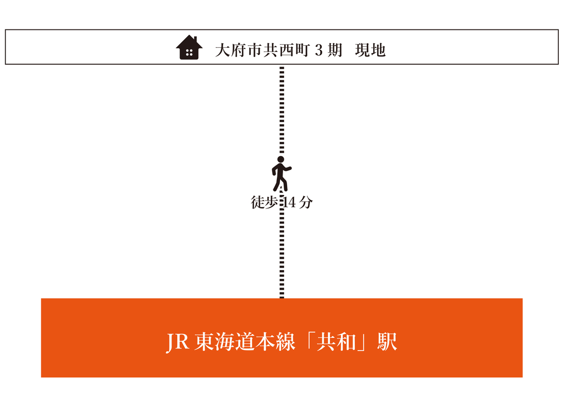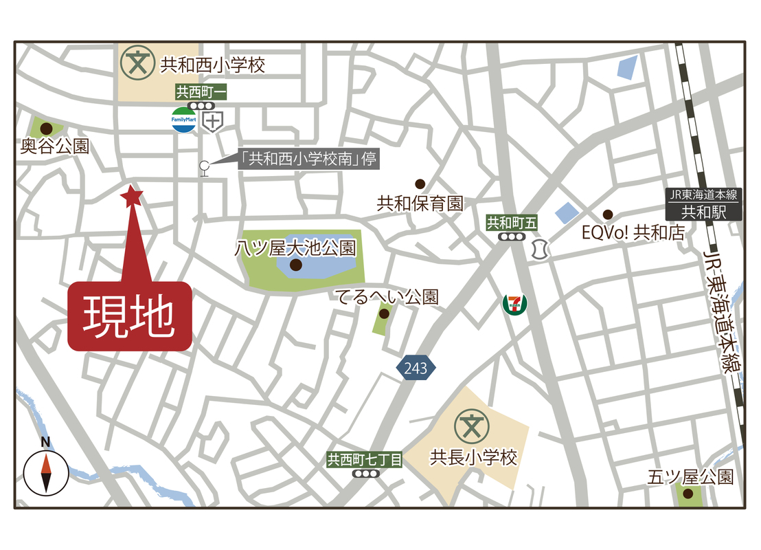 JR東海道本線「共和」駅 徒歩14分 大府市ふれあいバス「共和西小学校南」停 徒歩2分 |