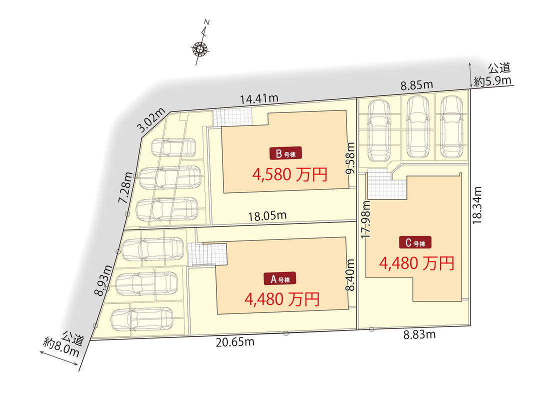 | 駐車場 | 3台 | 道路の幅員 | 北側公道幅員約5.9m、西側公道幅員約8.0m |