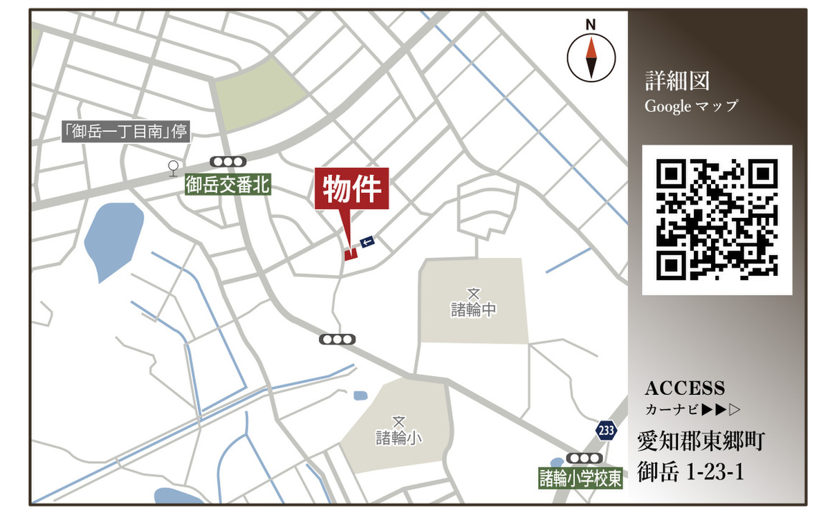 名鉄豊田線「米野木」駅 徒歩25分 名鉄豊田線「日進」駅 じゅんかい君「御岳一丁目南」停 徒歩6分 乗車9分 名鉄豊田線「日進」駅 徒歩27分 |