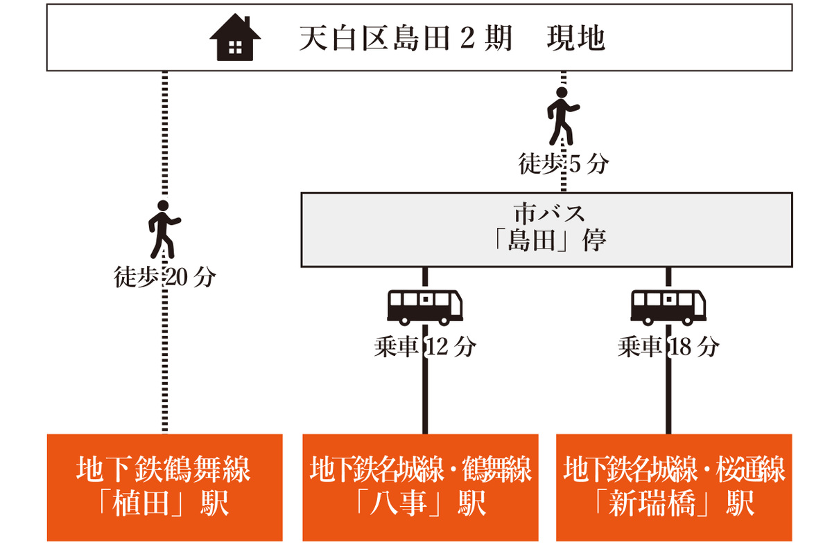 名古屋市営鶴舞線「植田」駅 徒歩20分 名古屋市営鶴舞線「八事」駅 市バス「島田」停 徒歩5分 乗車12分 名古屋市営桜通線「新瑞橋」駅 市バス「島田」停 徒歩5分 乗車18分 |