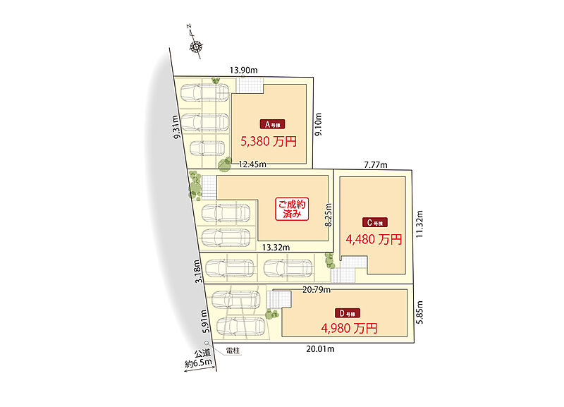 | 駐車場 | 2台 ~ 3台(C・D棟(2台)・A棟(3台)) | 道路の幅員 | 西側公道幅員約6.5m |