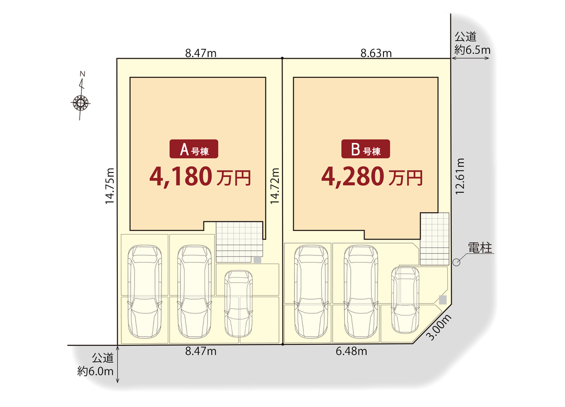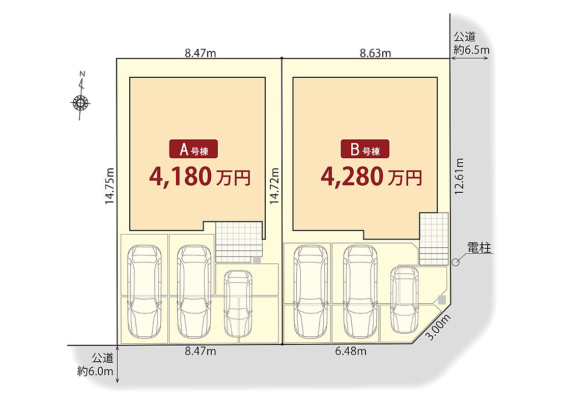 | 駐車場 | 2台 ~ 3台(車種によって3台駐車可能) | 道路の幅員 | 南側6.0m、東側6.5m |