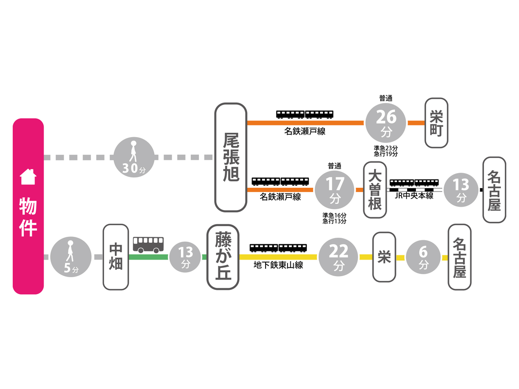 名古屋市営東山線「藤が丘」駅 名鉄バス「中畑」停 徒歩3分 名鉄バス「中畑」停からバス乗車約13分 名鉄瀬戸線「尾張旭」駅 徒歩30分 名鉄瀬戸線「旭前」駅 徒歩39分 |