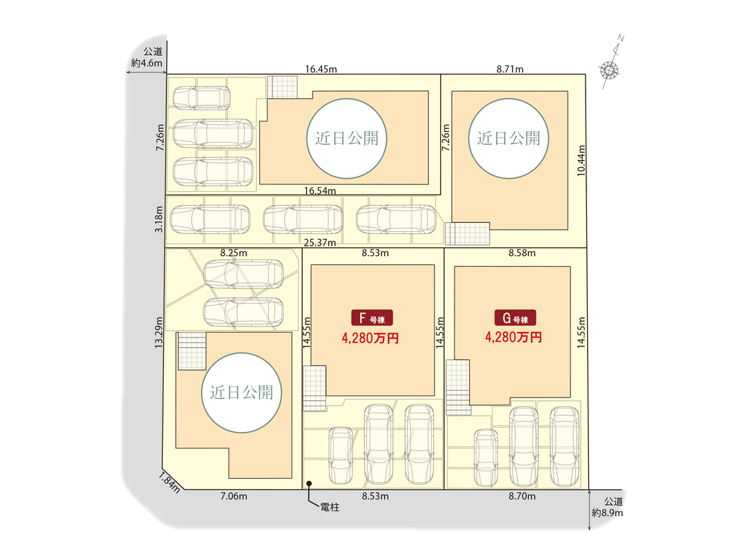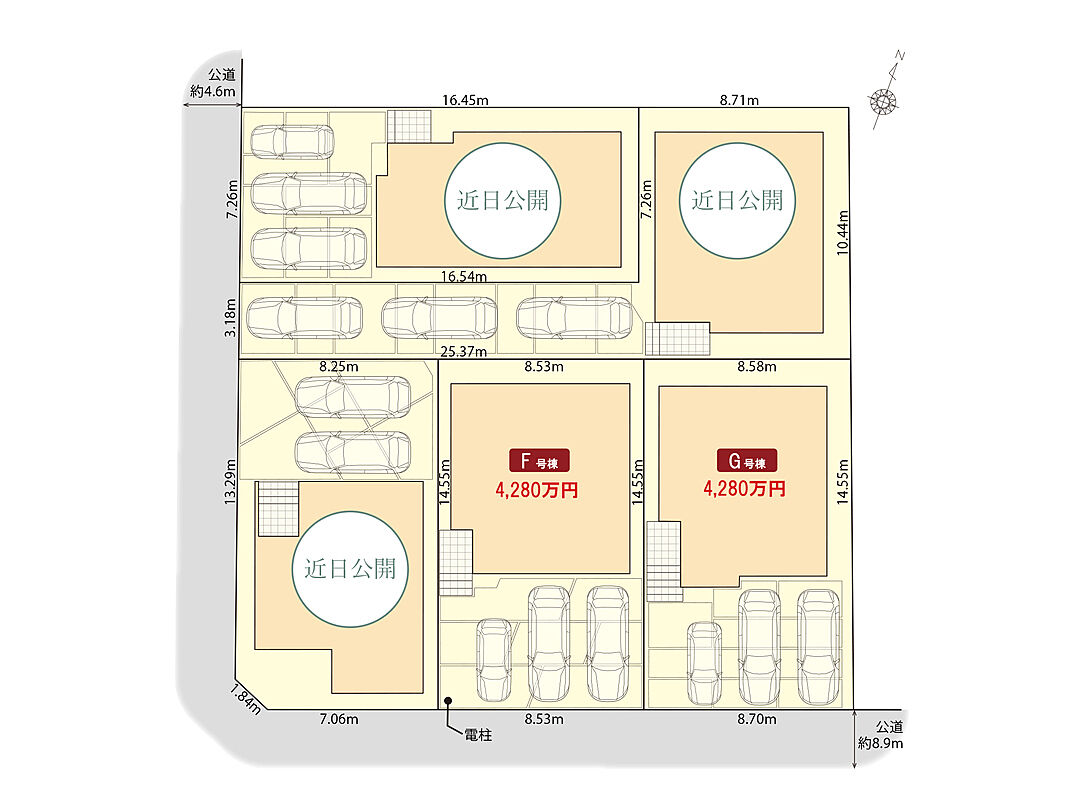 | 駐車場 | 2台 ~ 3台(3台(車種による):F号棟・G号棟) | 道路の幅員 | 西側4.6m、南側8.9m |