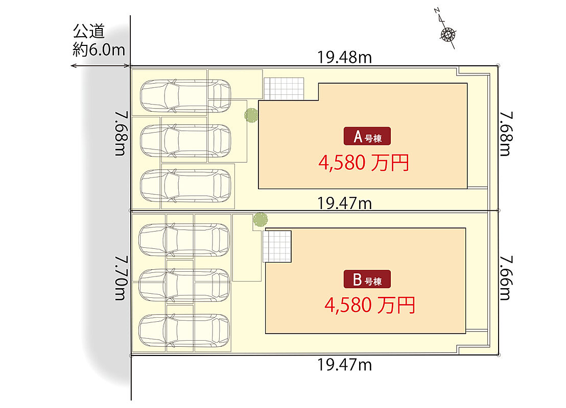 | 建物面積 | 104.14m2(A号棟)・104.56m2(B号棟) | 土地面積 | 149.60m2(A号棟)・149.59m2(B号棟) |