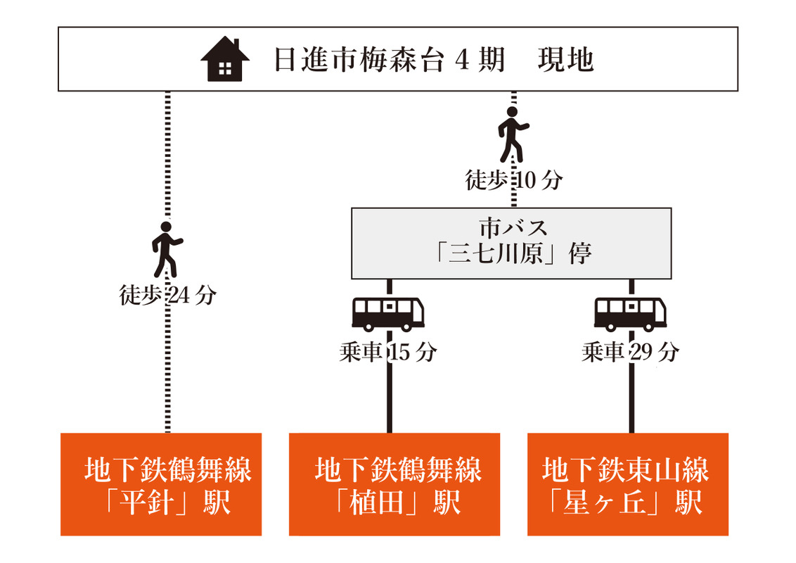 名古屋市営鶴舞線「平針」駅 徒歩24分 名古屋市営鶴舞線「植田」駅 市バス「三七川原」停 徒歩10分 乗車15分 名古屋市営鶴舞線「原」駅 徒歩29分 |
