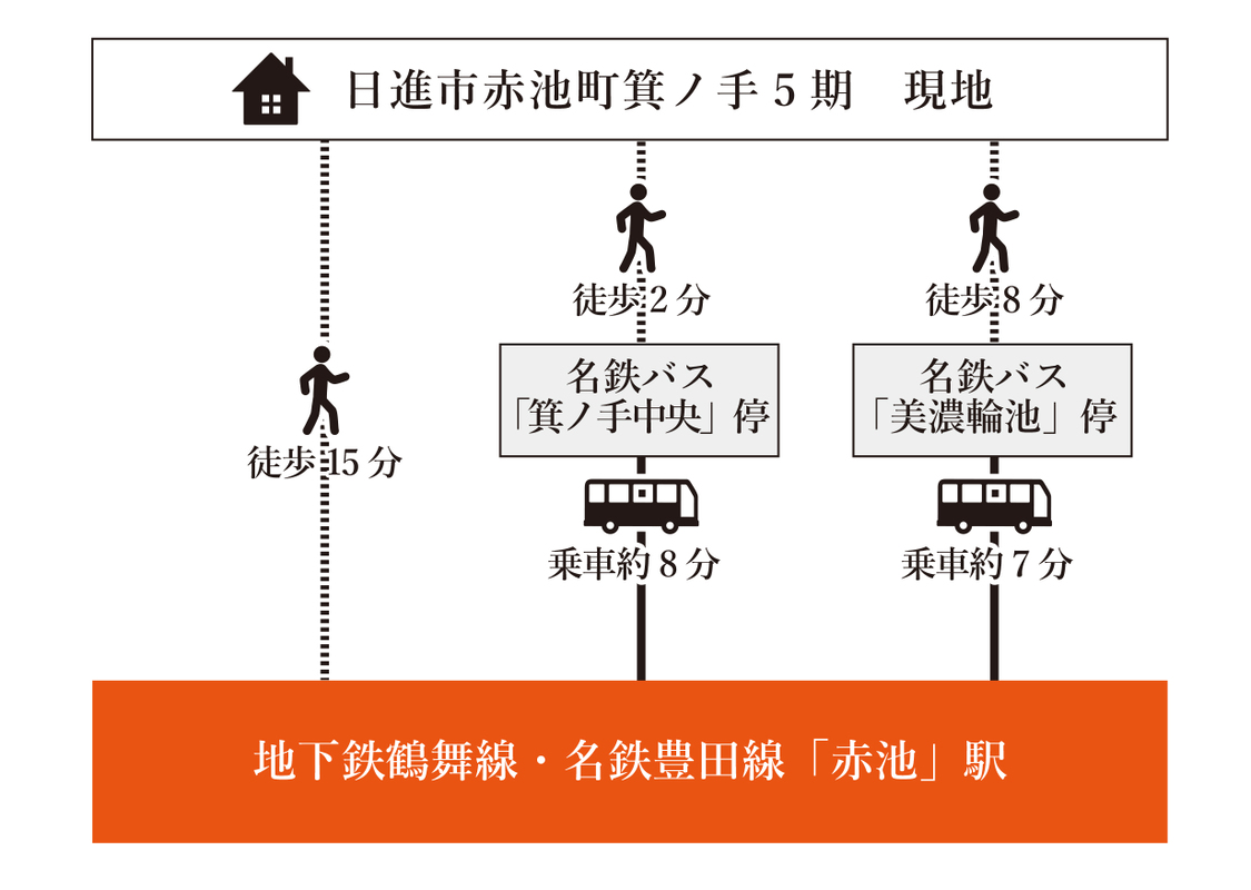 名古屋市営鶴舞線「赤池」駅 徒歩15分 名古屋市営鶴舞線「赤池」駅 名鉄バス「箕ノ手中央」停 徒歩2分 乗車8分 名古屋市営鶴舞線「平針」駅 徒歩32分 |