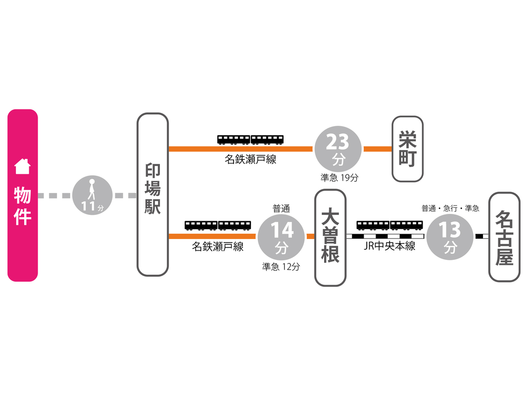 名鉄瀬戸線「印場」駅 徒歩11分 名鉄瀬戸線「大森・金城学院前」駅 徒歩14分 名鉄瀬戸線「旭前」駅 徒歩22分 |