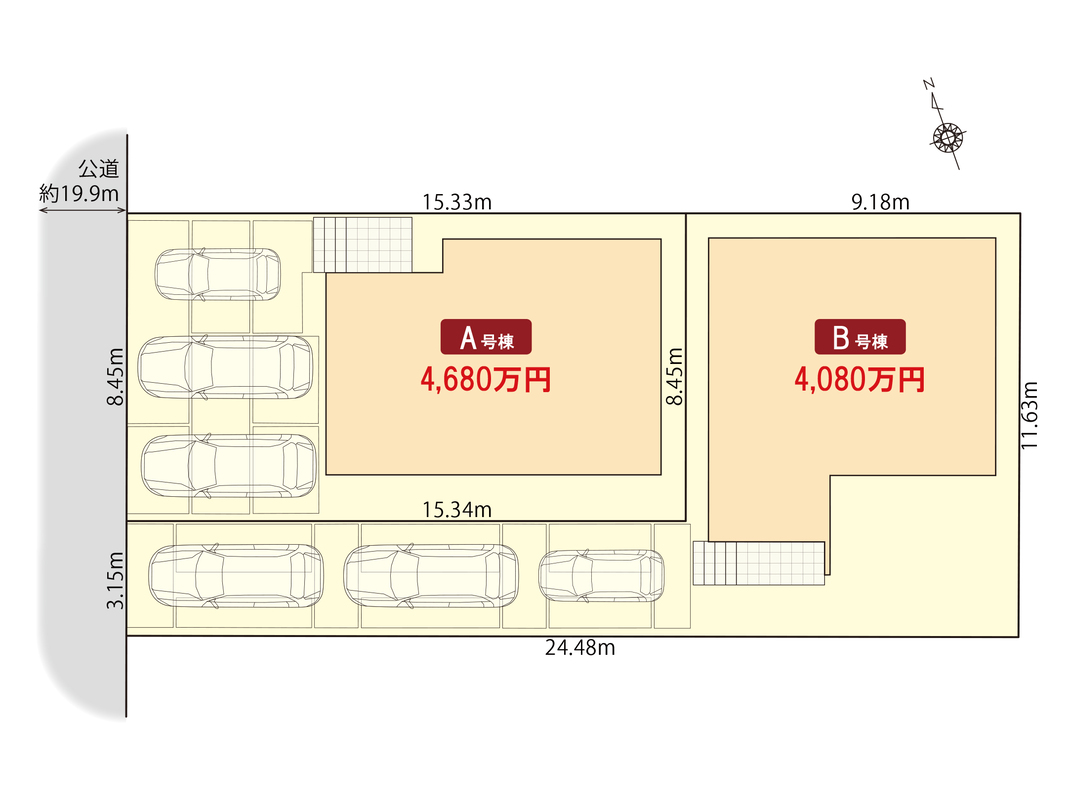 | 駐車場 | 3台(車種による:A号棟・B号棟) | 道路の幅員 | 西側19.9m |
