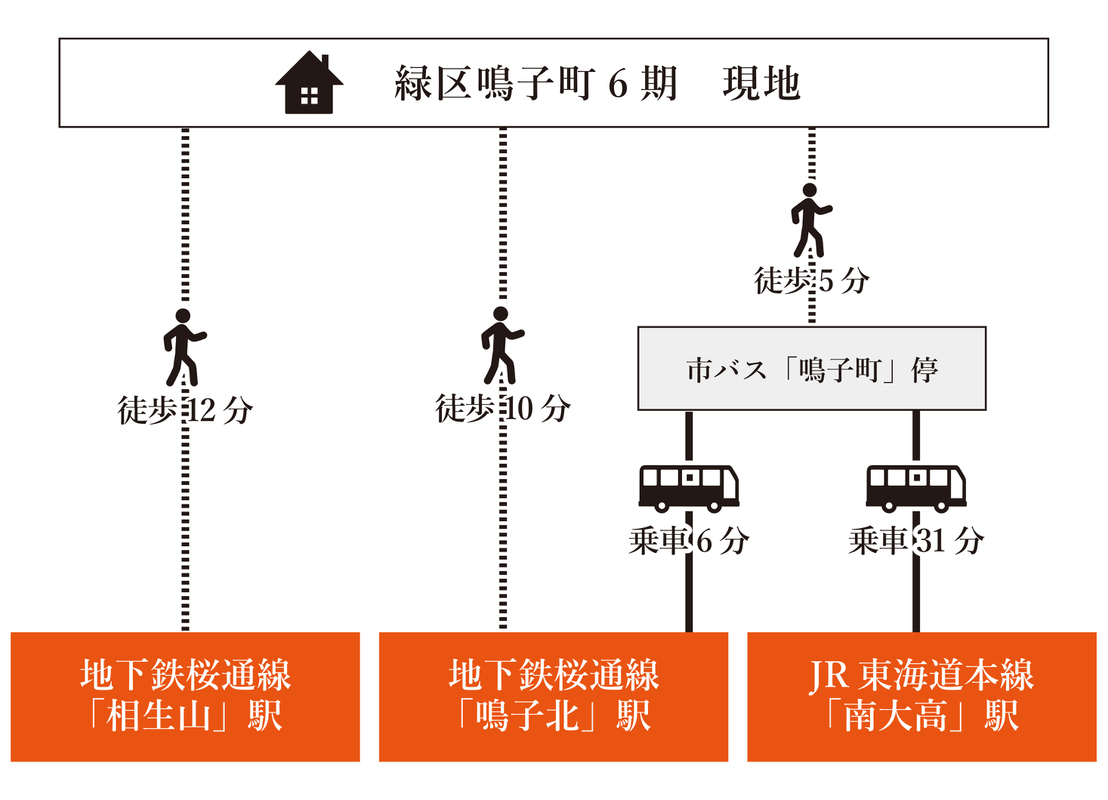 名古屋市営桜通線「鳴子北」駅 徒歩10分 名古屋市営桜通線「相生山」駅 徒歩12分 市営バス「鳴子町」停 徒歩5分 地下鉄桜通線「鳴子北」駅まで乗車6分 |