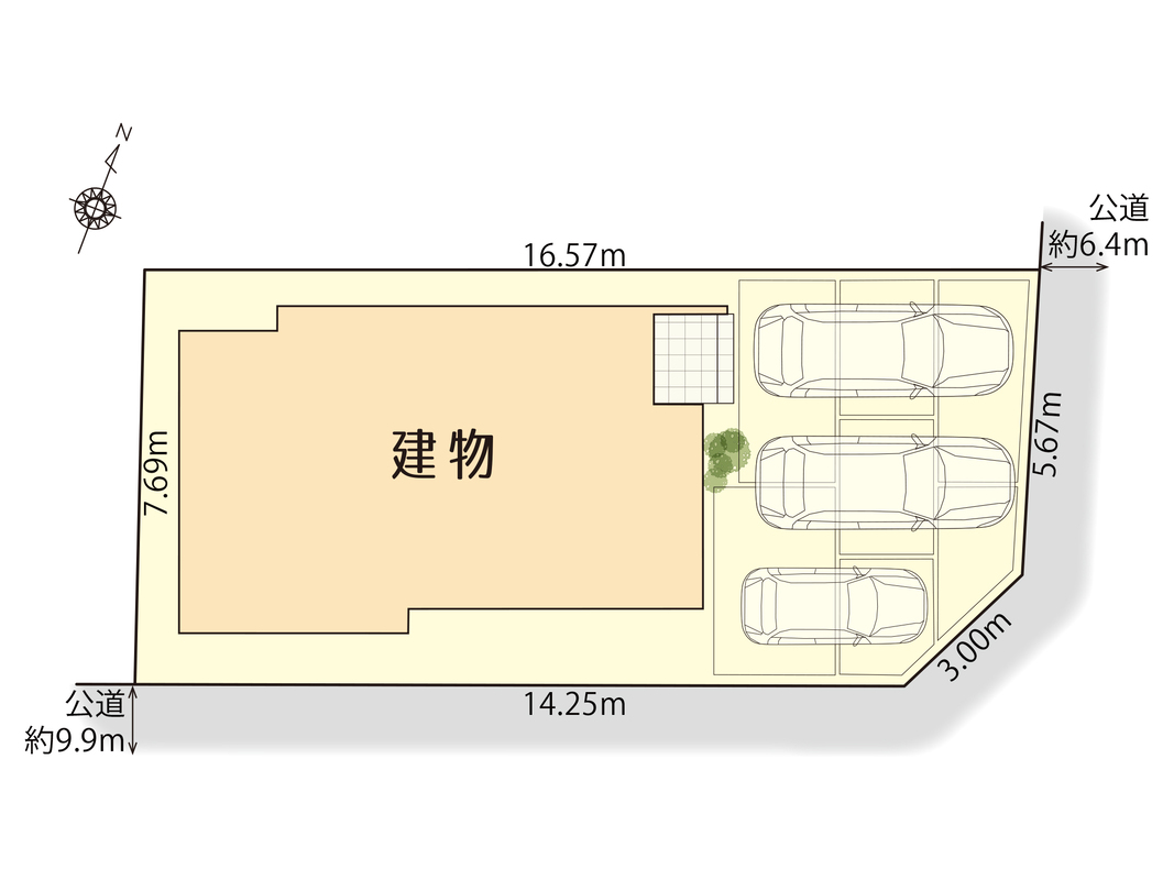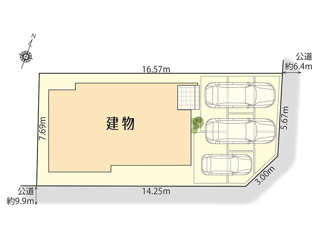 | 駐車場 | 3台(車種による) | 道路の幅員 | 北東側6.4m、南東側9.9m |