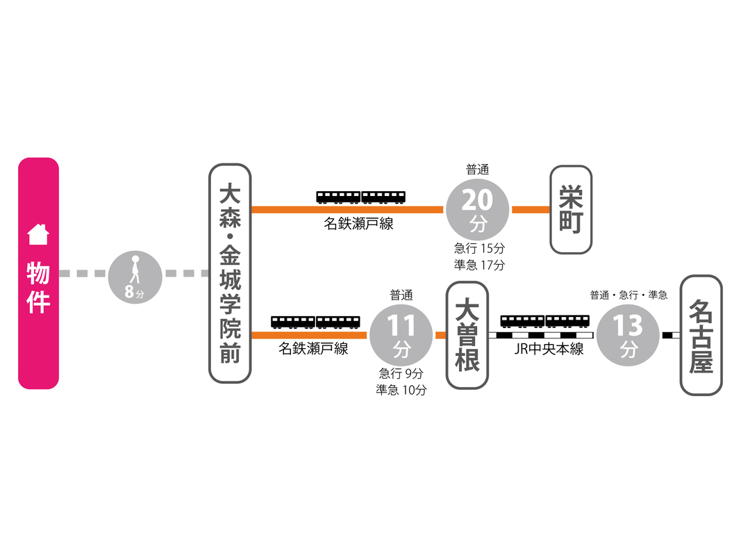 名鉄瀬戸線「大森・金城学院前」駅 徒歩8分 名鉄瀬戸線「喜多山」駅 徒歩16分 名鉄瀬戸線「印場」駅 徒歩22分 |