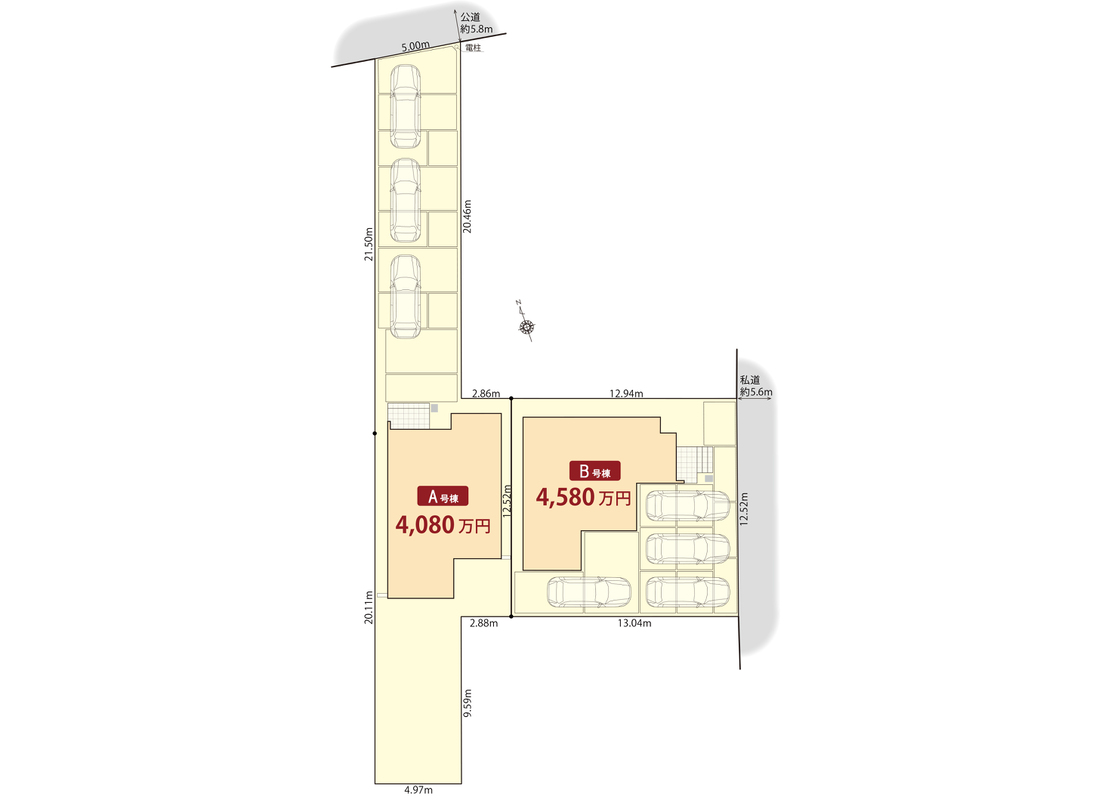 | 建物面積 | 104.56m2(B号棟)~104.76m2(A号棟) | 土地面積 | 162.75m2(B号棟)~244.35m2(A号棟) |