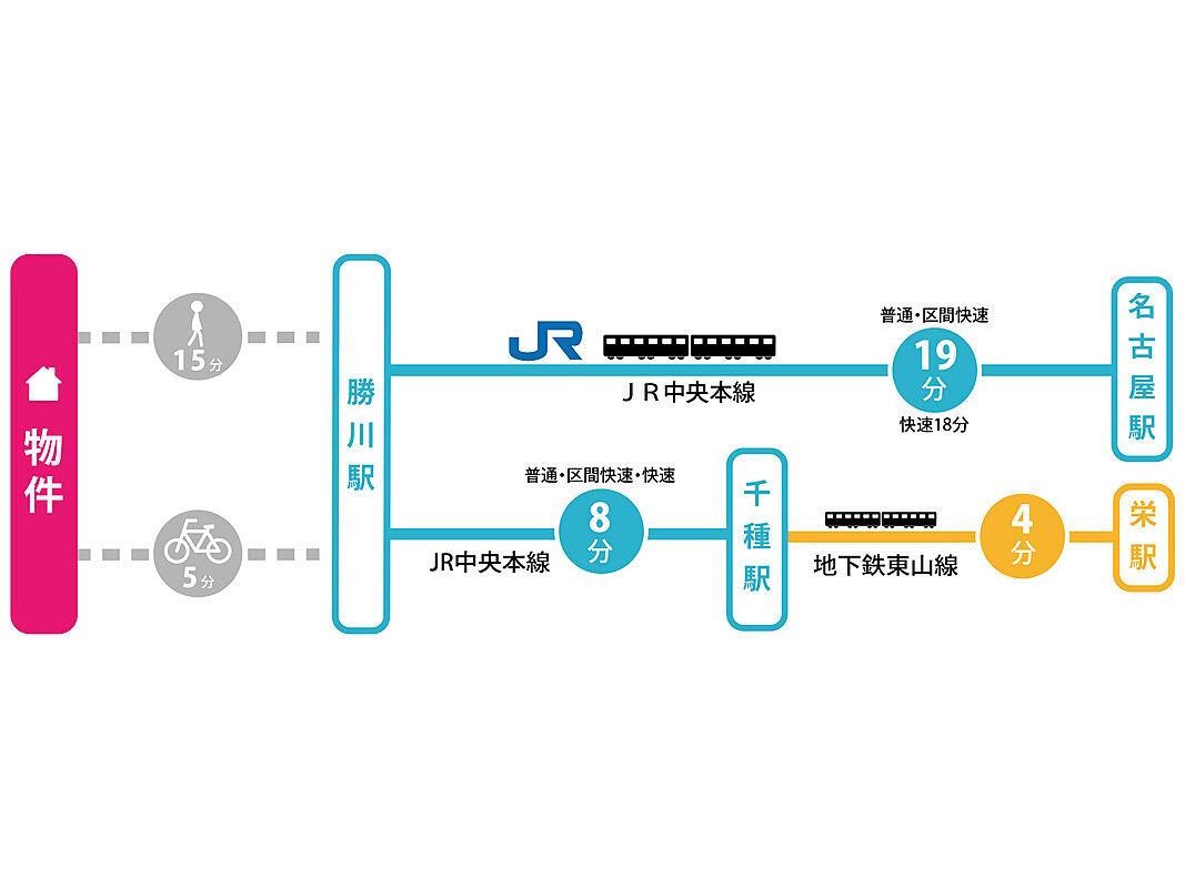 JR中央本線「勝川」駅 徒歩15分 名鉄小牧線「味美」駅 徒歩14分 JR東海交通城北線「味美」駅 徒歩24分 |