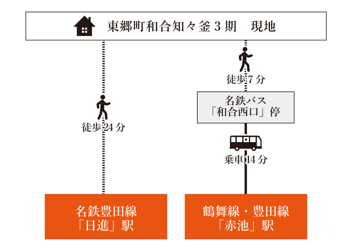 名鉄豊田線「日進」駅 徒歩24分 名古屋市営鶴舞線「赤池」駅 名鉄バス「和合西口」停 徒歩7分 乗車14分 名鉄豊田線「米野木」駅 徒歩45分 |