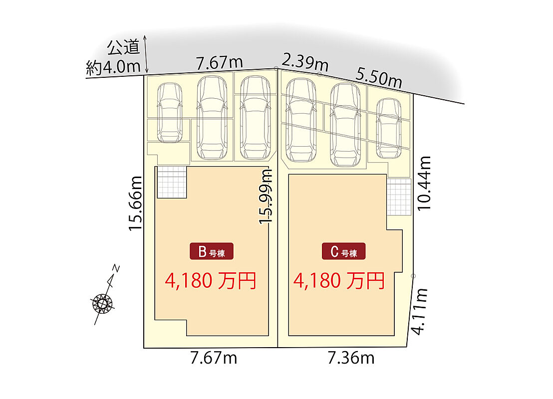 | 建物面積 | 103.11m2(B号棟)~104.34m2(C号棟) | 土地面積 | 118.25m2(C号棟)~121.49m2(B号棟) |