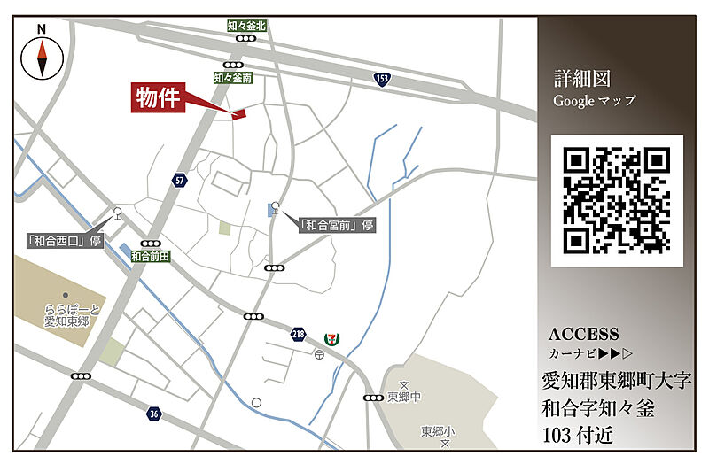 名鉄豊田線「日進」駅 徒歩24分 名古屋市営鶴舞線「赤池」駅 名鉄バス「和合西口」停 徒歩7分 乗車14分 名鉄豊田線「米野木」駅 徒歩45分 |