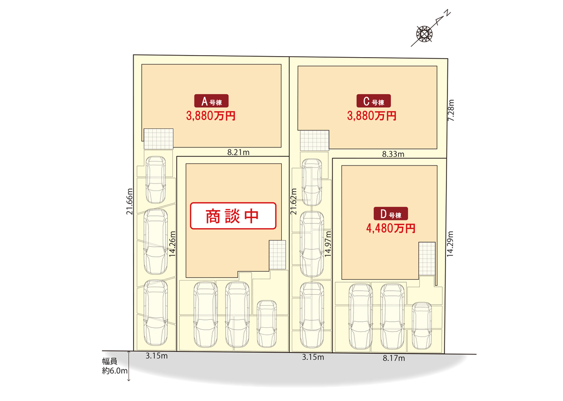 | 販売価格 | 3,880万円(A号棟)~4,480万円(D号棟) | 最多価格帯 | - |
