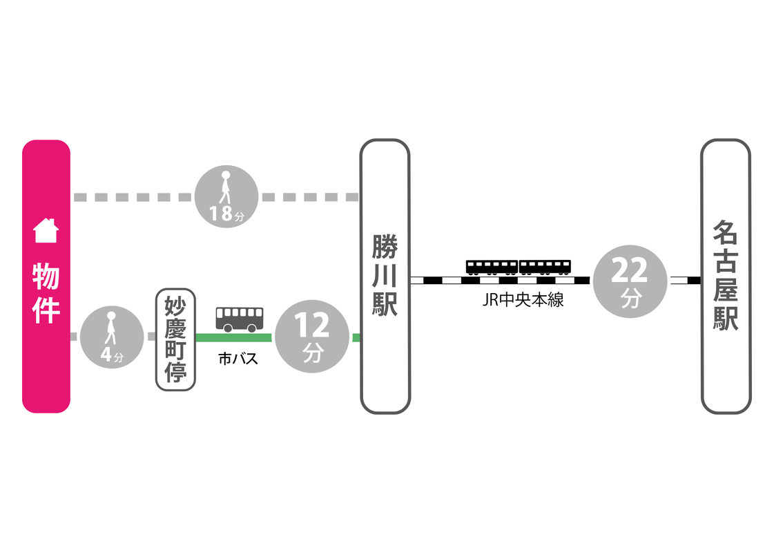 JR中央本線「勝川」駅 徒歩18分 名鉄小牧線「味美」駅 徒歩20分 JR中央本線「勝川」駅 市バス「妙慶町」停 徒歩4分 バス乗車12分 |