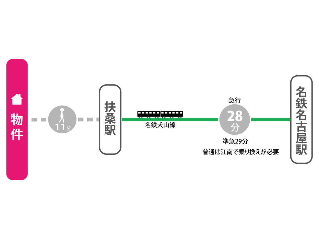 名鉄犬山線「扶桑」駅 徒歩11分 名鉄犬山線「木津用水」駅 徒歩17分 名鉄犬山線「柏森」駅 徒歩35分 |