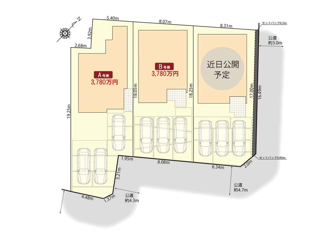 | 駐車場 | 3台 | 道路の幅員 | 南東側6.3m、北東側4.7m |
