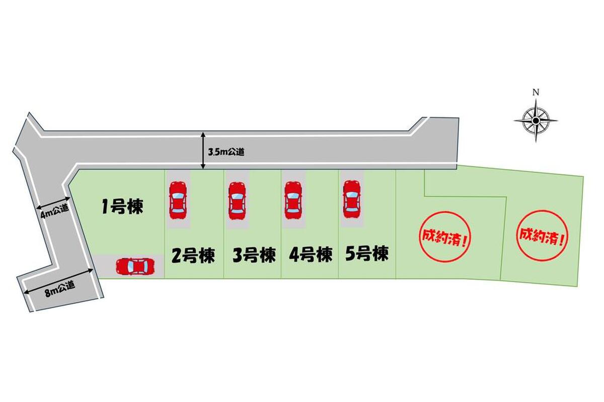 | 駐車場 | 1台 | 道路の幅員 | 道路幅:3.5m・4m、アスファルト舗装、西側4m公道、北側3.5m公道 |