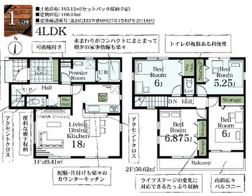 | 建物面積 | 100.03m2~113.8m2 | 土地面積 | 70.07m2・103.12m2 |