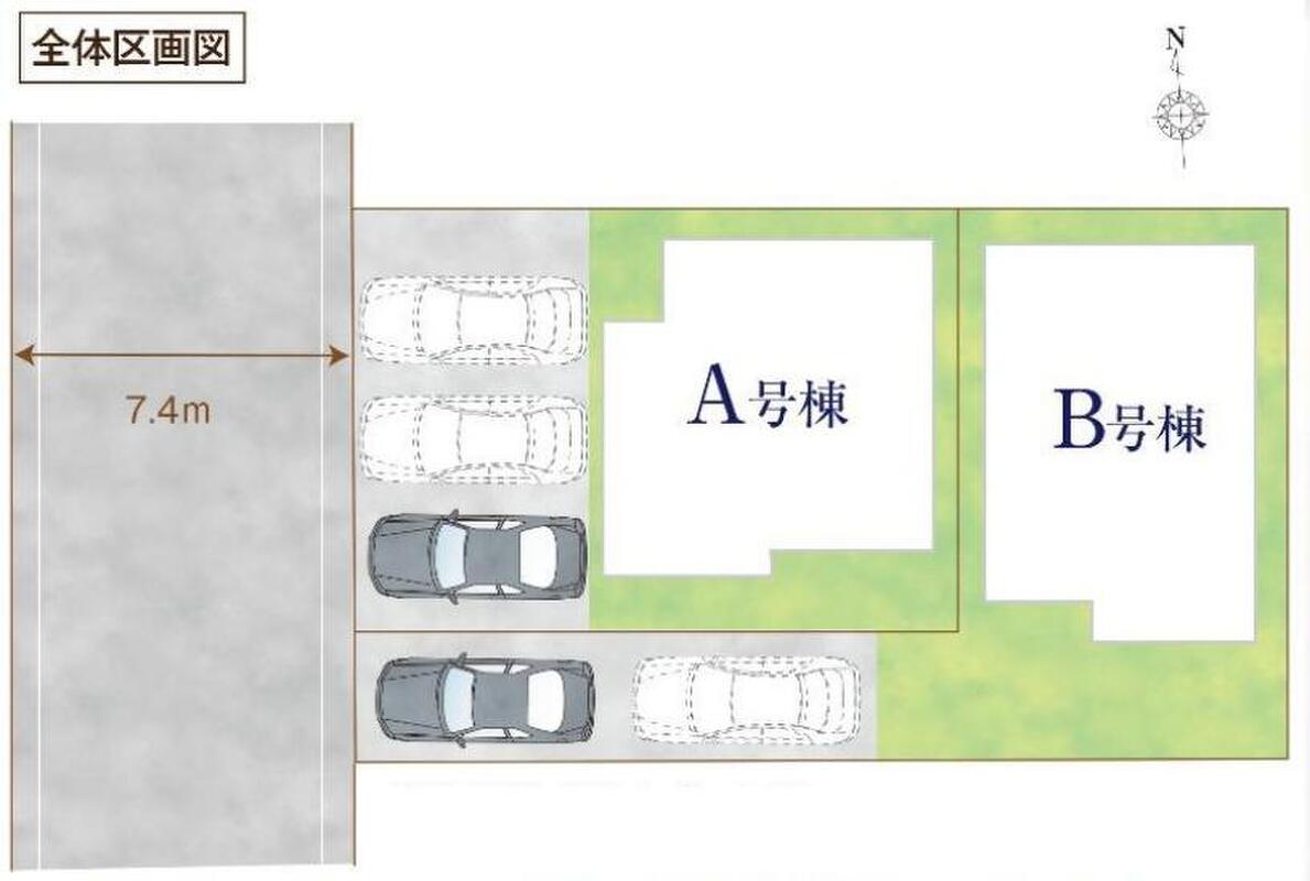 | 駐車場 | 2台 ~ 3台(A号棟(3台)・B号棟(2台)) | 道路の幅員 | 道路幅:7.4m、アスファルト舗装、西側約7.4m公道 |