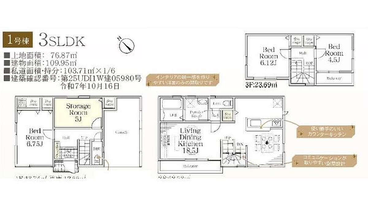 | 建物面積 | 109.95m2・112.17m2 | 土地面積 | 75.95m2・76.87m2 |