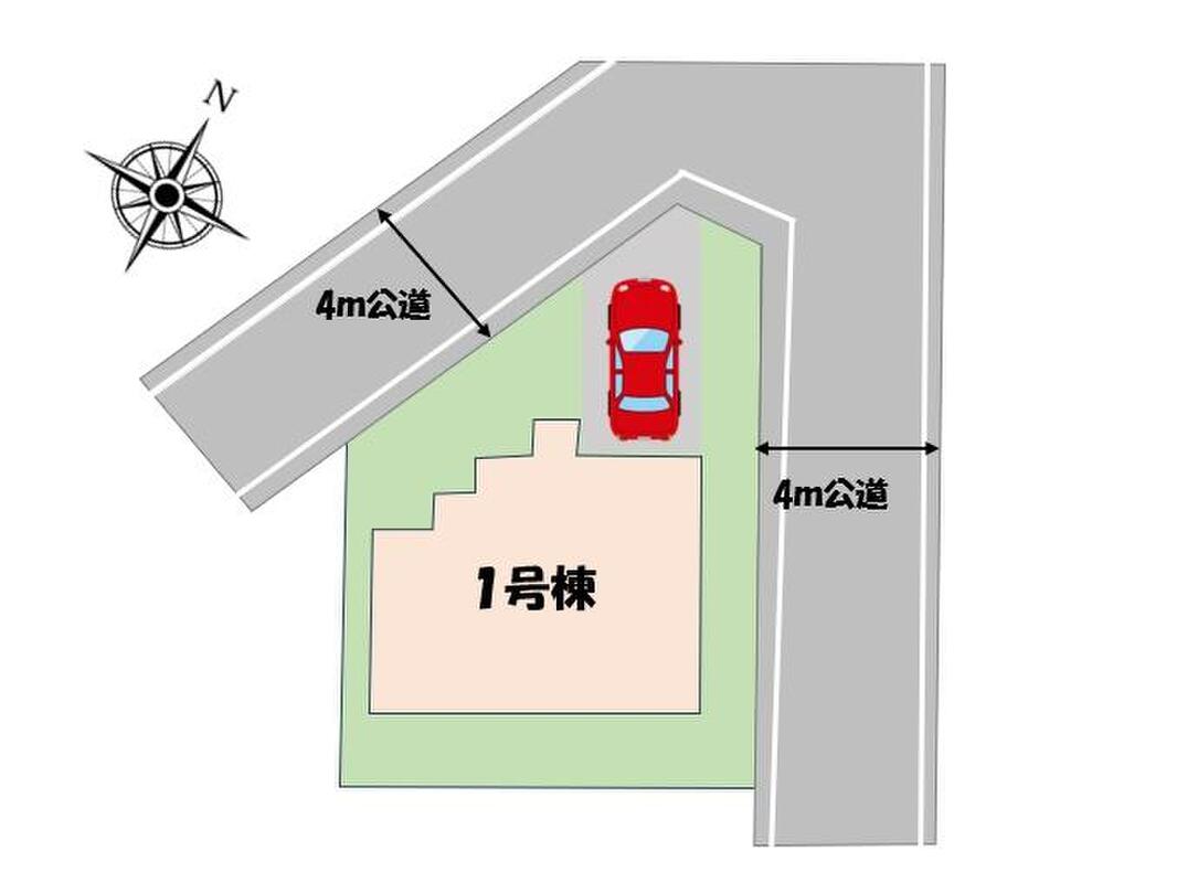 | 駐車場 | 1台 | 道路の幅員 | 道路幅:4m、アスファルト舗装、北東 4m 公道、北西 4m 公道 |